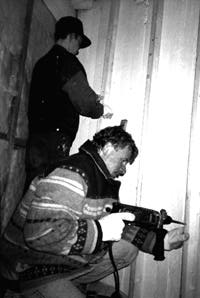 Toinen sateen aiheuttama riesa oli puutavaran ja levyjen sahaus. Märässä räntäsateessa se ei ole kovinkaan miellyttävää puuhaa, joten suoritimme ko. työvaiheet pääsääntöisesti tornin portaikossa. Kaksi miestä ja ahtaus, sanoisin.