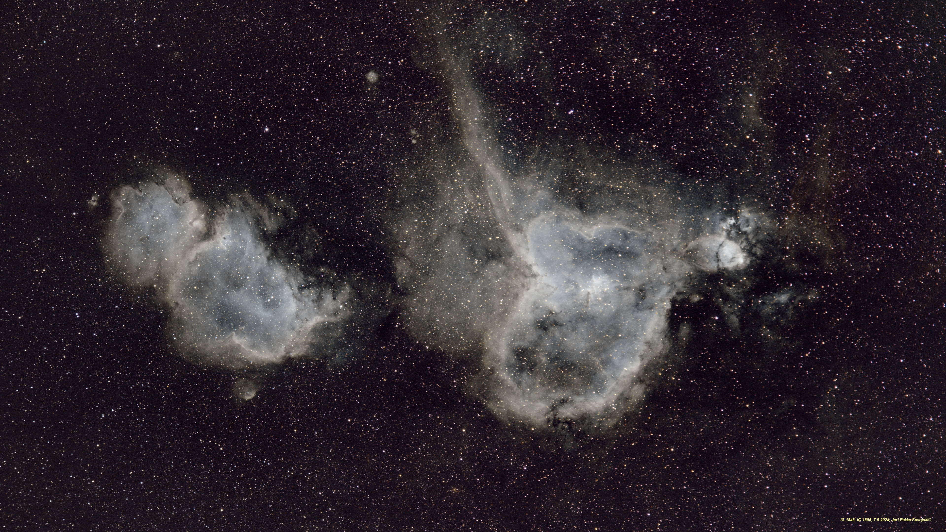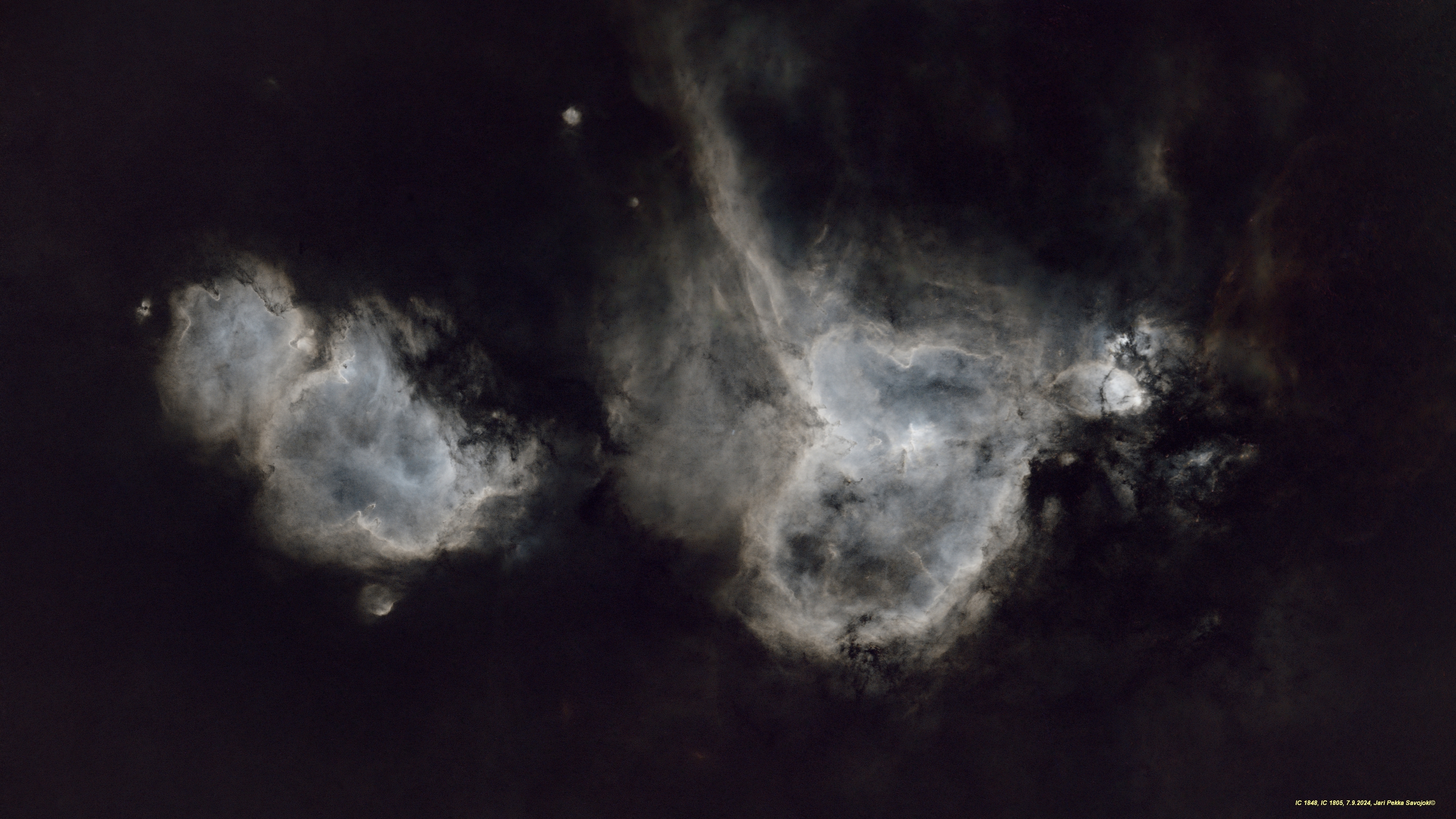 Artjärven Syvätaivas tapahtumassa 7.9.2024 kuvattu: Sielu- ja Sydänsumu. Kuvan käsittely PixInsight ohjelmalla. Laitteisto: EQ6 Pro, Tokina F 2.8 300mm, ASI6200MM, Baader F 3 narrowband Ha,OIII, SII filters , Guide camera on guide 400mm telescope. |