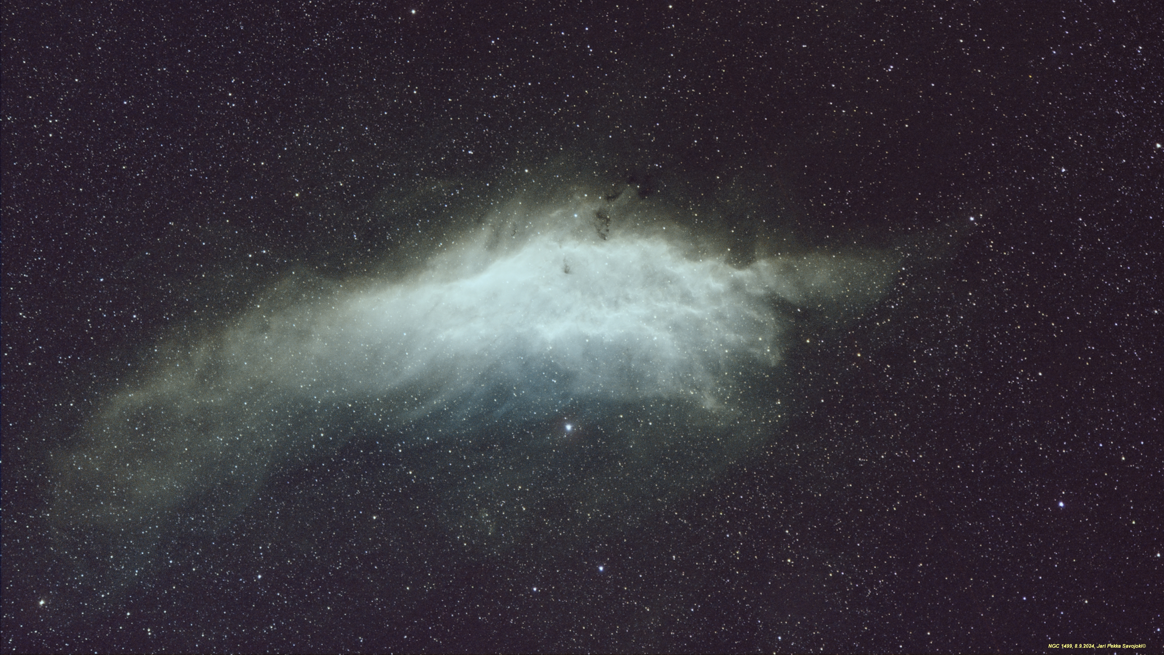 Artjärven Syvätaivas tapahtumassa 8.9.2024 kuvattu: Kaliforniasumu. Kuvan käsittely PixInsight ohjelmalla. Laitteisto: EQ6 Pro, Tokina F 2.8 300mm, ASI6200MM , Baader F 3 narrowband Ha,OIII, SII filters , Guide camera on guide 400mm telescope. |