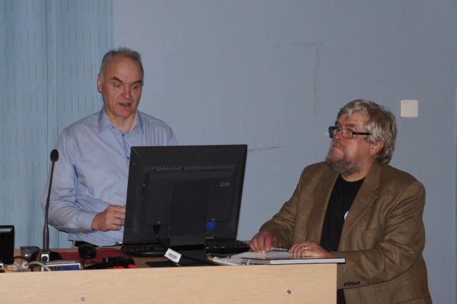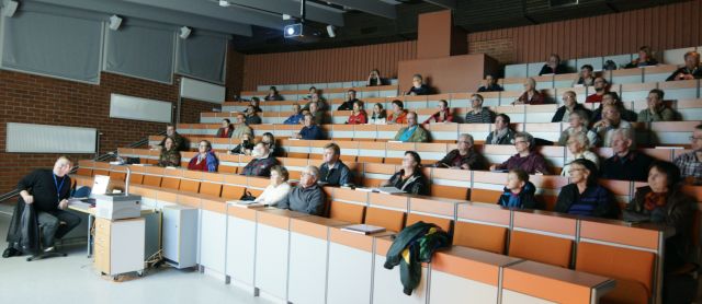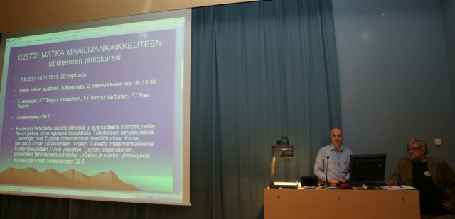 Kurssi2 Tähtieteen jatkokurssi alkoi 7.9.2011 Salon lukion auditoriossa. Yläkuvissa vasemmalla UrSalon puheenjohtaja Pekka Mikkola avaamassa kurssia ja kertomassa kurssin käytännön järjestelyistä ja oikealla ensimmäisen luennon pitänyt FT Hannu Karttunen Turun yliopiston Tuorlan observatoriolta.