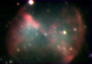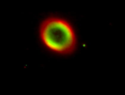 <= Syksyllä 2008 kuvaamamme kuva M57:stä tai NGC6720:sta eli Lyyran rengassumusta. Kuvauspaikka on Halikon tähtitorni ja kalustona Ursalon CCD kamera ja tornin kaukoputki. Kuvaajina Pekka Mikkola ja Jari Pekka Savojoki. |