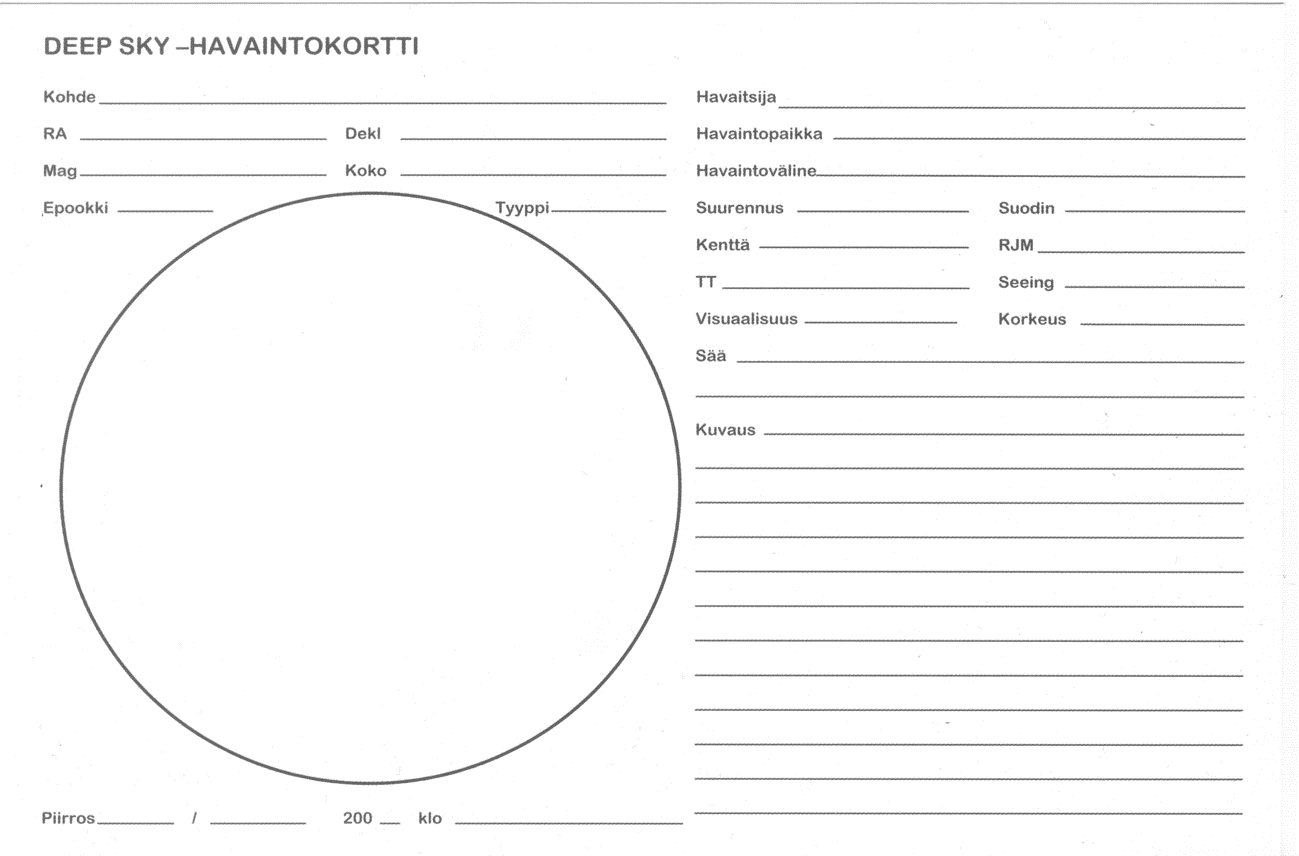 Kilpailuun voi osallistua myös mm. Ursan Deep-Sky havaintokortilla, josta riittää täytettynä nuo yllä mainitut tiedot. Enemmänkin saa toki täyttää. Kortin takapuolella on tilaa nimelle ja yhteystiedoille.