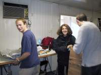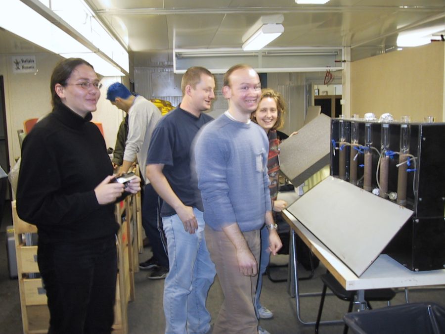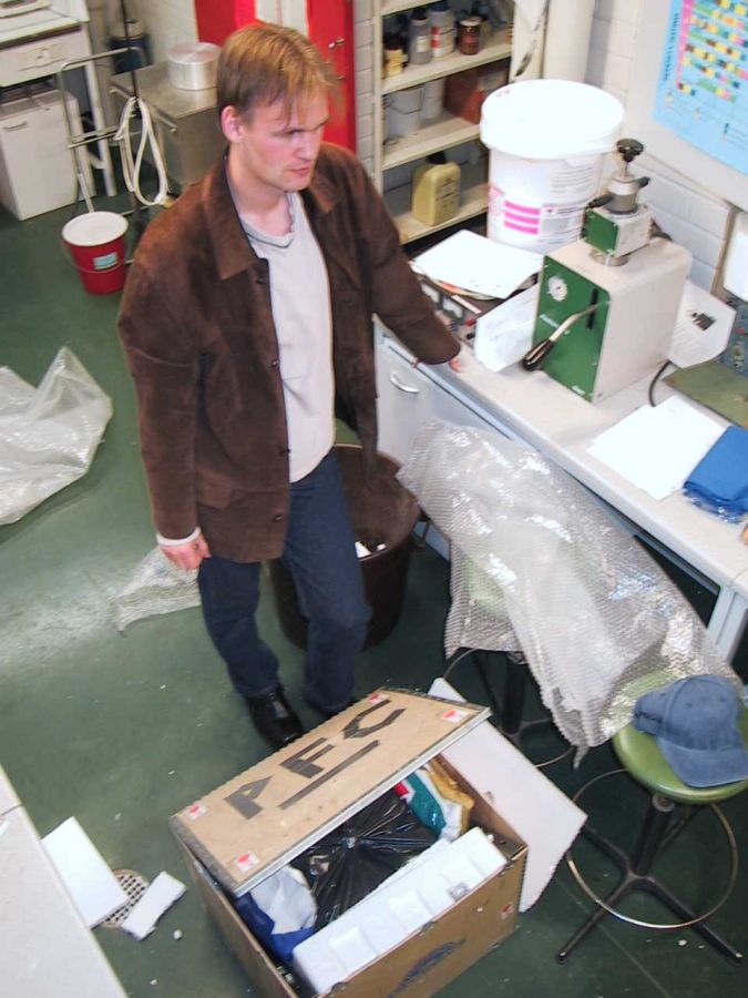 Jo miltei aamusta tarkastusryhmä hyväksyi laitteeseemme asetetut pehmusteet ja näytteiden säilytyksen ja saimme luvan lastata laitteistomme koneeseen.