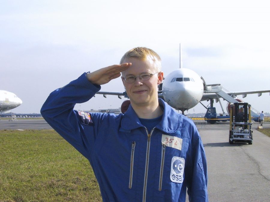 Koneeseen nousu sujui vielä rutiinilla mutta kiitotien päässä alkoi tuntua että tällä kertaa ei olla millään reittilennolla. Take off ja korkeutta alkoi kertyä heti mukavasti. Alle 15 minuuttia ja oltiin tavoitekorkeudessa, noin 25000 jalassa, ja saimme siirtyä laitteistojemme luokse. Kun alkuvalmistelut saatiin suoritettua alkoi odotus. Ensimmäiseen totuttelubarabolaan oli aikaa muutama minuutti. Hetken päästä tunsimmekin jo painomme normaalia raskaampana ja 22 sekunnin odottamisen jälkeen olimme vapaita painovoiman kahleista. Tunne oli aluksi sekava. Ensimmäiseksi tunsin putoavan, kuten Wubbo oli varoitellut, mutta jo muutaman sekunnin päästä tunne vaihtui leijailemiseksi. Itse asiassa se tuntui aika pitkälle samalta kuin olin kuvitellutkin. Vaikka olin varautunut siihen että painottomuudessa kaikki liikkeet pitää tehdä rauhallisesti ja kontrolloidusti oli alussa vaikeuksia. Liian nopeasti ja liian paljon voimaa. Mutta jo muutaman parabolin jälkeen oli havaittavissa oppimista ja kontrolli lisääntyi. Ehkä hienointa lennolla oli huomata se, että pystyi pienillä liikkeillä, sormella työntämällä, liikuttamaan itseään. Samalla tavalla kuin niin monesti on nähnyt jonkun muun tekevän tv:ssä tai elokuvassa.