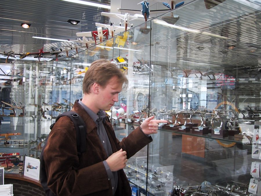 Ensiksi kävimme tutustumassa museon kauppaan. Täältähän löytyy pienoismalleja, koottavia ja julisteita joka lähtöön. Mitähän konetta täältä ei löytyisi? No, ei ainakaan Drakenia :-( Kun olimme ensiällistyksestä toipuneet lähdimme tutkimaan museon muita osia.